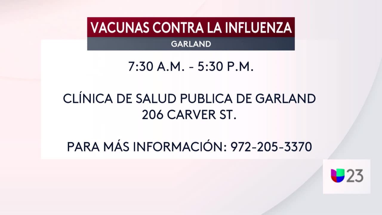La clínica publica de la ciudad de Garland tiene vacunas contra la gripe disponible de 7:30 a.m. hasta las 5:30 p.m. para adultos, niños y personas de la tercera edad. Hay opciones de pagos para los que no tiene seguro médico. Para más información llame al 972-205-3370.