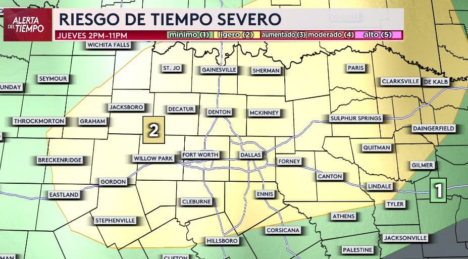 Nuestra meteoróloga Nelly Carreño nos advierte sobre posibles tormentas aisladas este jueves 22 de mayo en el norte de Texas. Aunque muchos no verán ni una gota de lluvia, existe riesgo de granizo grande y ráfagas de viento de hasta 60 mph entre la 1 p.m. y las 10 p.m., dependiendo de la zona. Dallas-Fort Worth está en nivel 2 de 5 en la escala de riesgo severo. El peligro de tornados es bajo, pero no se descarta.