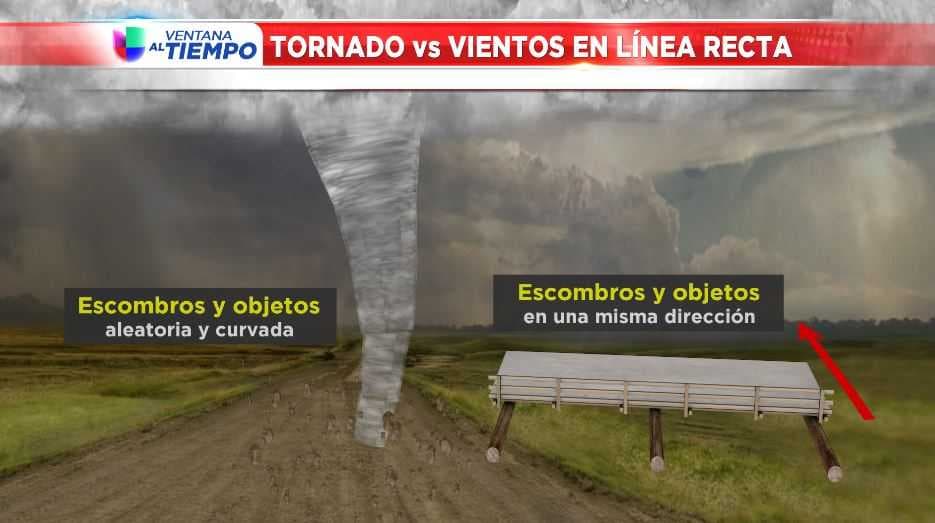 Un tornado tenderá a tirar los escombros de manera aleatoria. Un árbol puede haber caído en una dirección, mientras que otro árbol cercano puede haber caído en una dirección completamente opuesta. Algunas vigas metálicas y/o troncos de árboles pueden haberse torcido. Solo un tornado contiene vientos lo suficientemente fuertes como para quitar la corteza de un árbol, arrancar el césped o pavimentar la superficie de la carretera. Durante un evento de daño por viento en línea recta, los árboles tenderán a ser empujados hacia abajo en una sola dirección o en un patrón similar a un abanico en una distancia considerable.