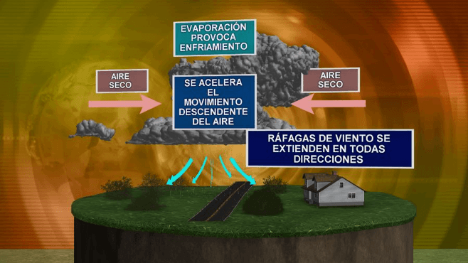 Es común que las tormentas severas estén acompañadas de fuertes ráfagas de vientos en línea recta. Vientos que ocurren a alta velocidad, pero en breve período de tiempo. En términos simples, vientos en línea recta, es una fuerte corriente descendente que va desde la tormenta y se acelera a medida que se acerca al suelo. Una vez que llegan a superficie, estos vientos fuertes pueden extenderse en forma de abanico o continuar en una sola dirección.