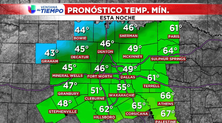 En el norte de Texas se esperan algunos aguaceros y tormenta aisladas, pero no anticipamos lluvia constante o tiempo severo. Aunque será una noche fría, las temperaturas no bajarán al punto de congelación. Durante la madrugada las mínimas estarán en los 40 grados Fahrenheit en el norte de nuestra región y en los 50 en Dallas/Fort Worth. Esto quiere decir que no nos tenemos que preocupar de tiempo invernal o hielo.