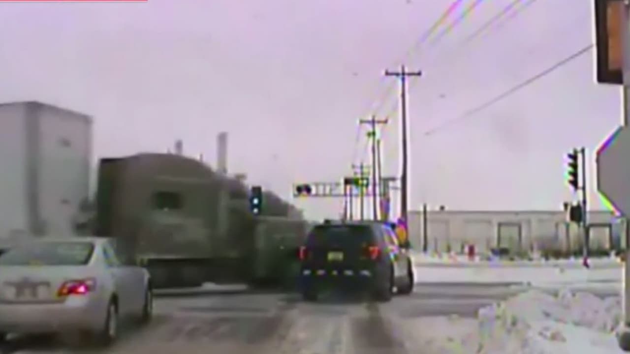 Un oficial de seguridad pública estuvo cerca de morir luego de que un camión fuera de control impactara su patrulla