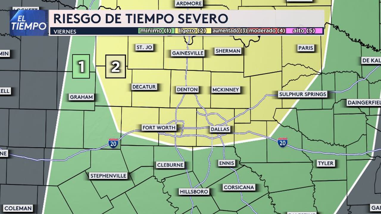 Un sistema se aproxima al Norte de Texas el viernes, trayendo la baja posibilidad de algunas tormentas aisladas por la tarde con probabilidad del 20%. Sin embargo, algunas de estas tormentas podrían ser severas. Por ahora, te decimos cuáles son los condados que están en riesgo de tiempo severo, principalmente por vientos fuertes y granizo.