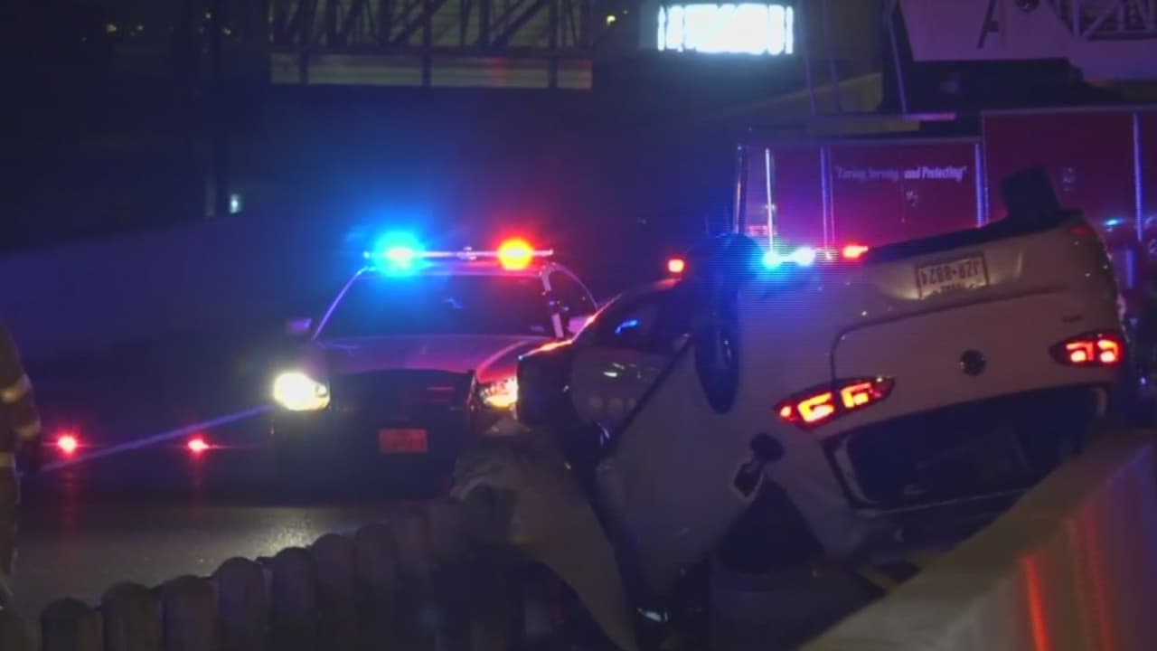 El vehículo en el que se movilizaba la persona que murió chocó contra las barandas del canal de peaje de la autopista 35 en Dallas, quedando boca abajo y con fuertes daños.