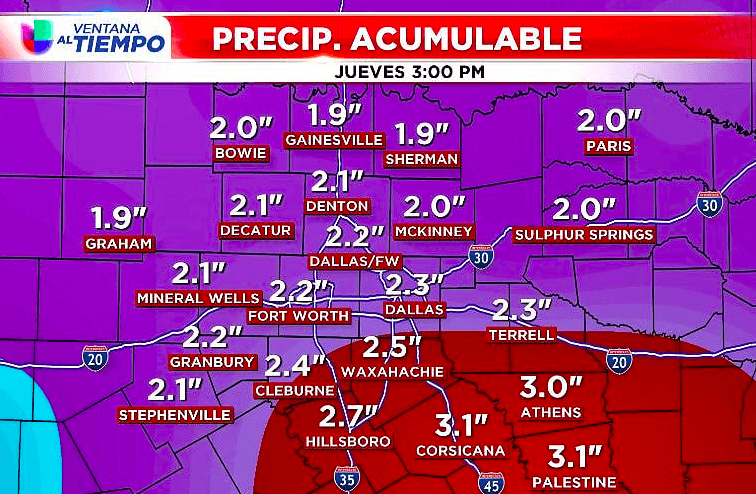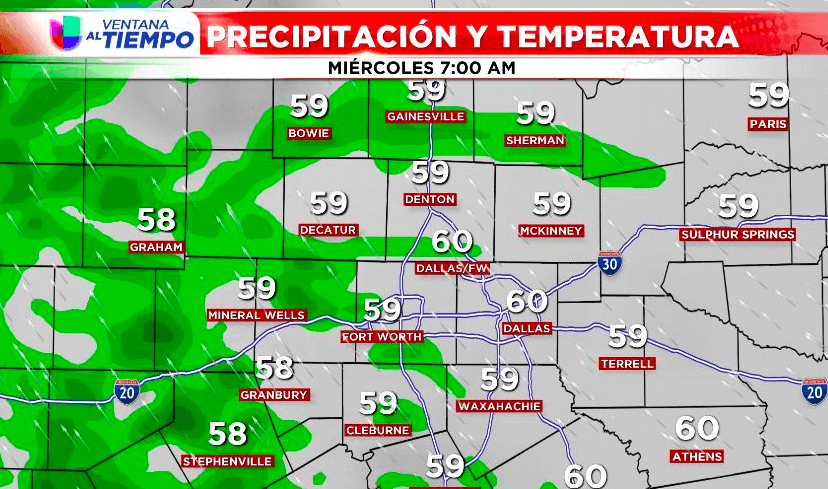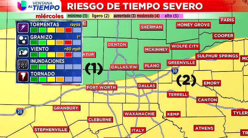 En la tarde, adelante de un frente frío se formará una línea de fuertes tormentas que se moverá del oeste hacia el este sobre el metroplex. El riesgo principal será lluvia intensa, de 1” a 3” de precipitación. Los riesgos secundarios serán granizo de 1 pulgada de diámetro, vientos de hasta 60 mph y algunos tornados.