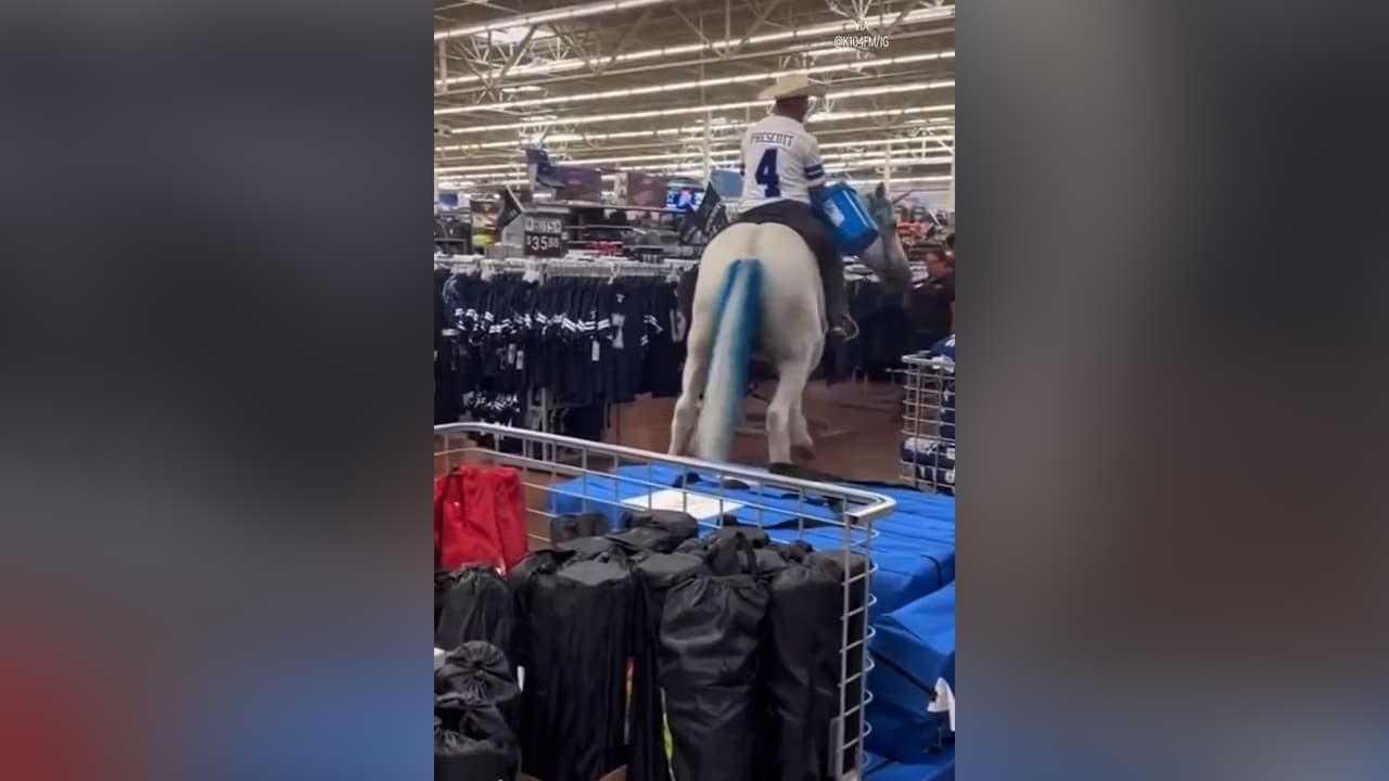 Un hombre monta a caballo en Walmart después de la victoria de los Cowboys de Dallas