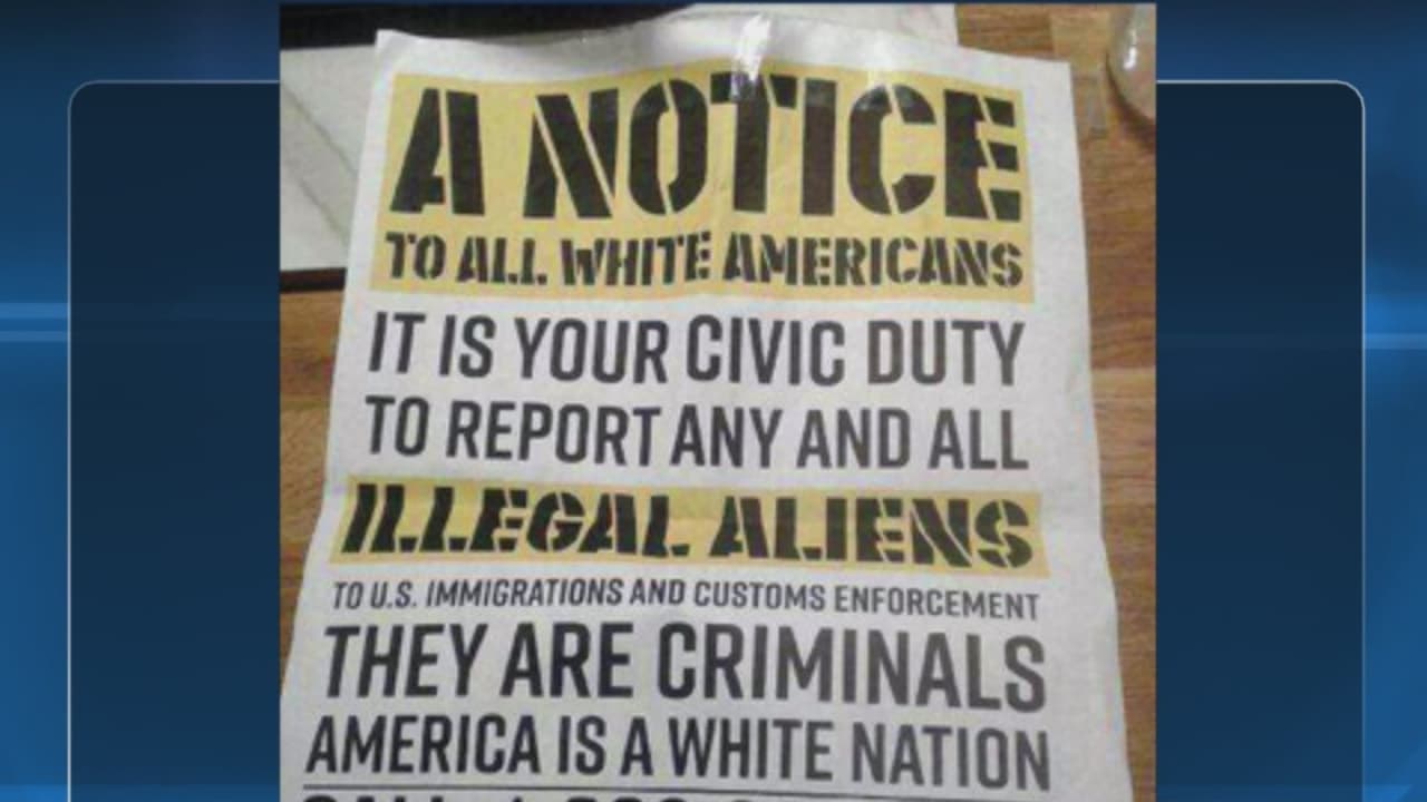 En el volante se lee la siguiente leyenda: “Hacemos un llamado a todos los americanos. Es su deber cívico reportar a cualquiera, o a todos los inmigrantes legales. Para el servicio de inmigración y naturalización de los Estados Unidos ellos son criminales. América es una nación blanca.”