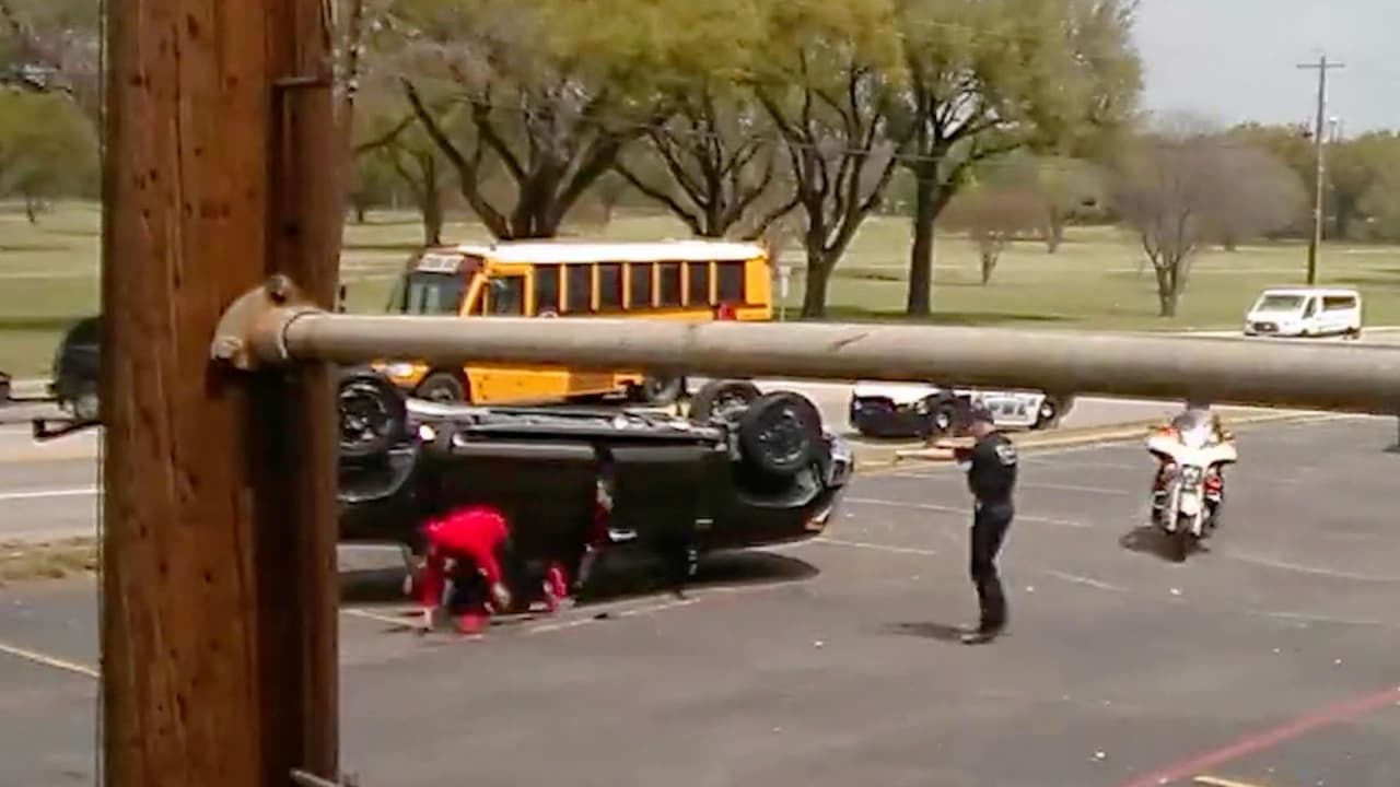 Un conductor y siete jóvenes viajaban en una camioneta con reporte de robo, cuando en su intento por huir de oficiales de la policía de Dallas se volcaron en el cruce de Buckner y Samuell.