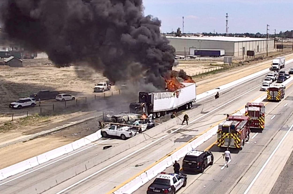 Según reportes preliminares de la página de la Patrulla de Caminos de California, o CHP por sus siglas en inglés, tras el impacto, un camión explotó y habría incendiando a otros vehículos.
