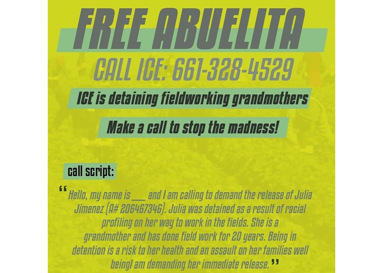 La arrestada responde al nombre de Sofía, sin embargo, se encuentra detenida bajo el nombre de Julia Jiménez. Por eso, aquellas personas que puedan apoyar la campaña Free Abuelita, deben llamar al número 661-328-4529 y decir lo siguiente: