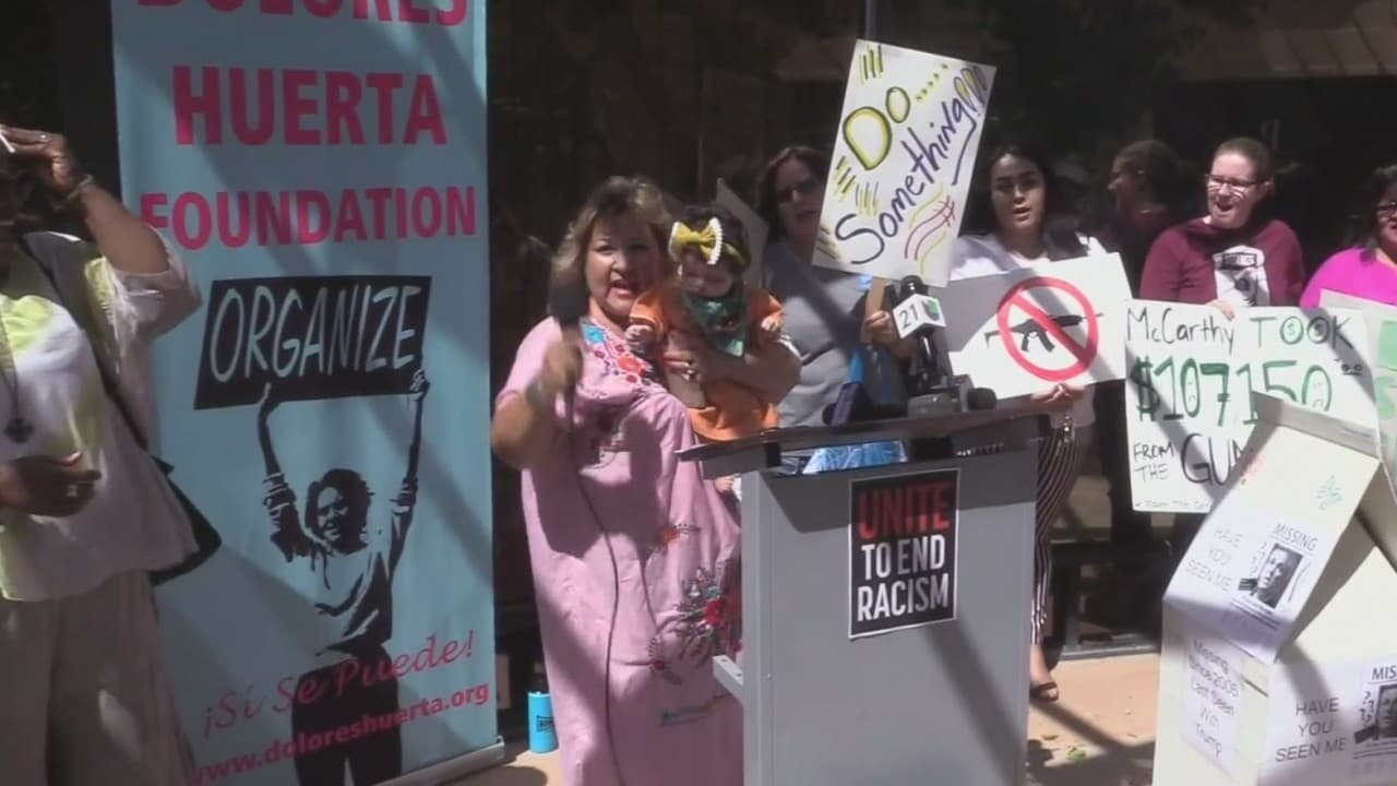 Los manifestantes, entre los que estaban incluidos miembros de la organización Dolores Huerta, aseguraron que algunos de los tiroteos han estado motivados por el odio racial y pidieron un control de armas.