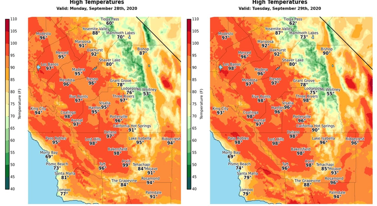 Para este lunes y martes se esperan temperaturas máximas promedio por sobre los 10ºF para esta época del año, en el Valle Central de California. En tanto, en Los Ángeles "debido al clima muy caluroso y seco con ráfagas de viento de Santa Ana, se emitió una alerta de incendios para el lunes para las montañas de Los Ángeles, condado de Ventura y el Valle de Santa Clarita", dice el aviso del NWS.