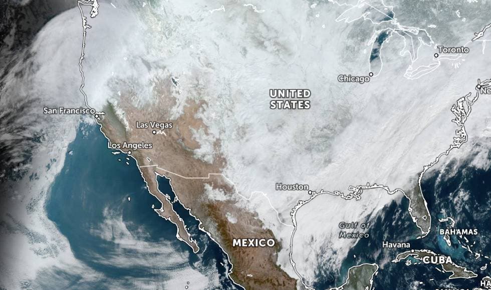 El 18 de febrero pasado imágenes del satélite ESRI de NOAA revelaron que el 70% del país se encontraba cubierto de nieve, mientras que California se apreciaba extremadamente seco.