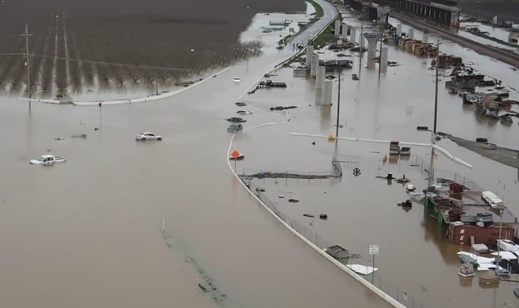 El agua ha inundado los campos de cultivo y destruido varias carreteras, como la autopista 43 al este de Corcoran, cerrada porque el agua la ha cubierto por completo.