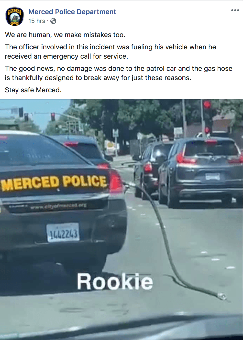 Justificado o no, lo cierto es que un oficial del Departamento de Policía de Merced salió literalmente corriendo para atender una emergencia, sin darle tiempo de sacar la manguera de gasolina y sin terminar de llenar su tanque.