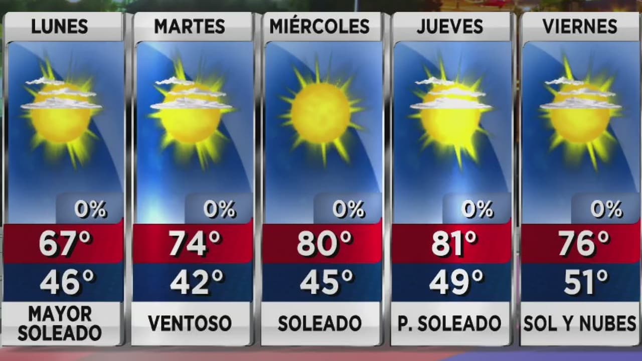 Este lunes predominarán las condiciones soleadas, con temperaturas máximas de 67 grados.