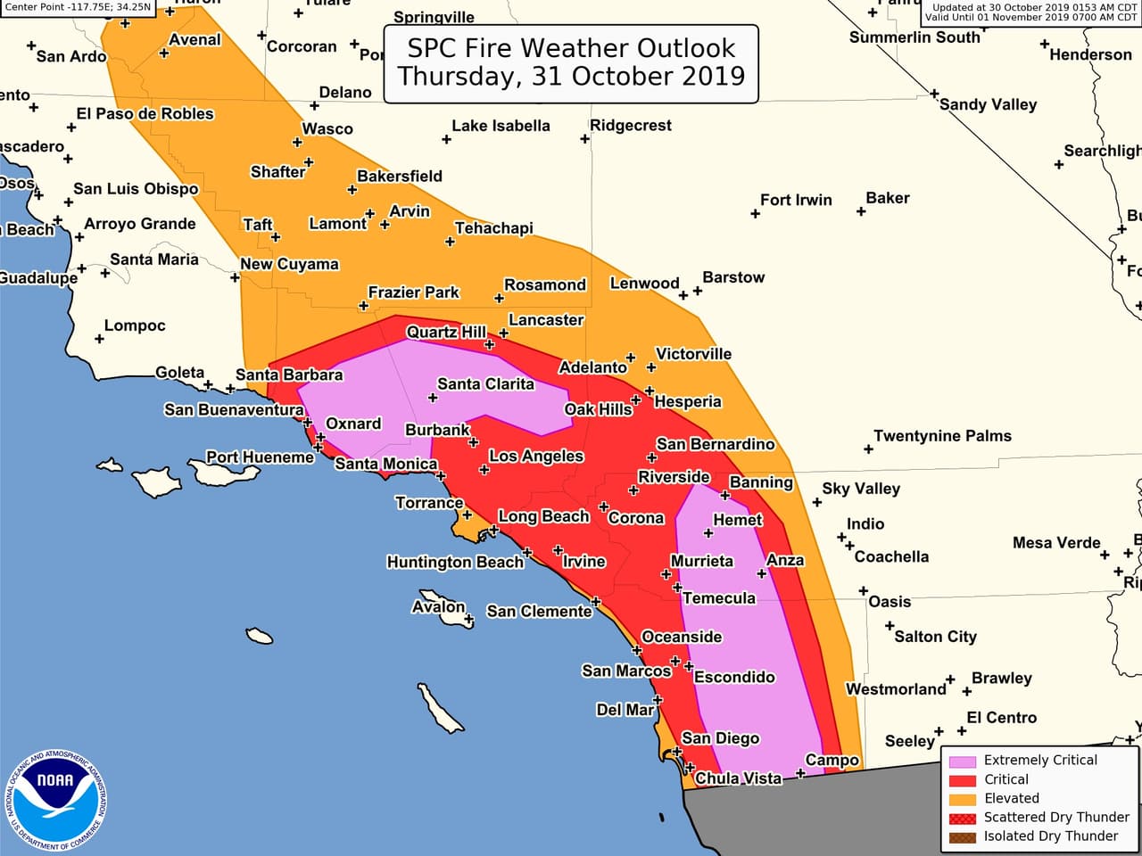 Para California, la alerta roja por riesgo de incendios forestales continuará hasta la jornada de mañana jueves, dismiuyendo su peligrosidad. Durante este miércoles 30 de octubre, la alerta fue extrema, mientras que para este jueves se proyecta un riesgo 'elevado'.