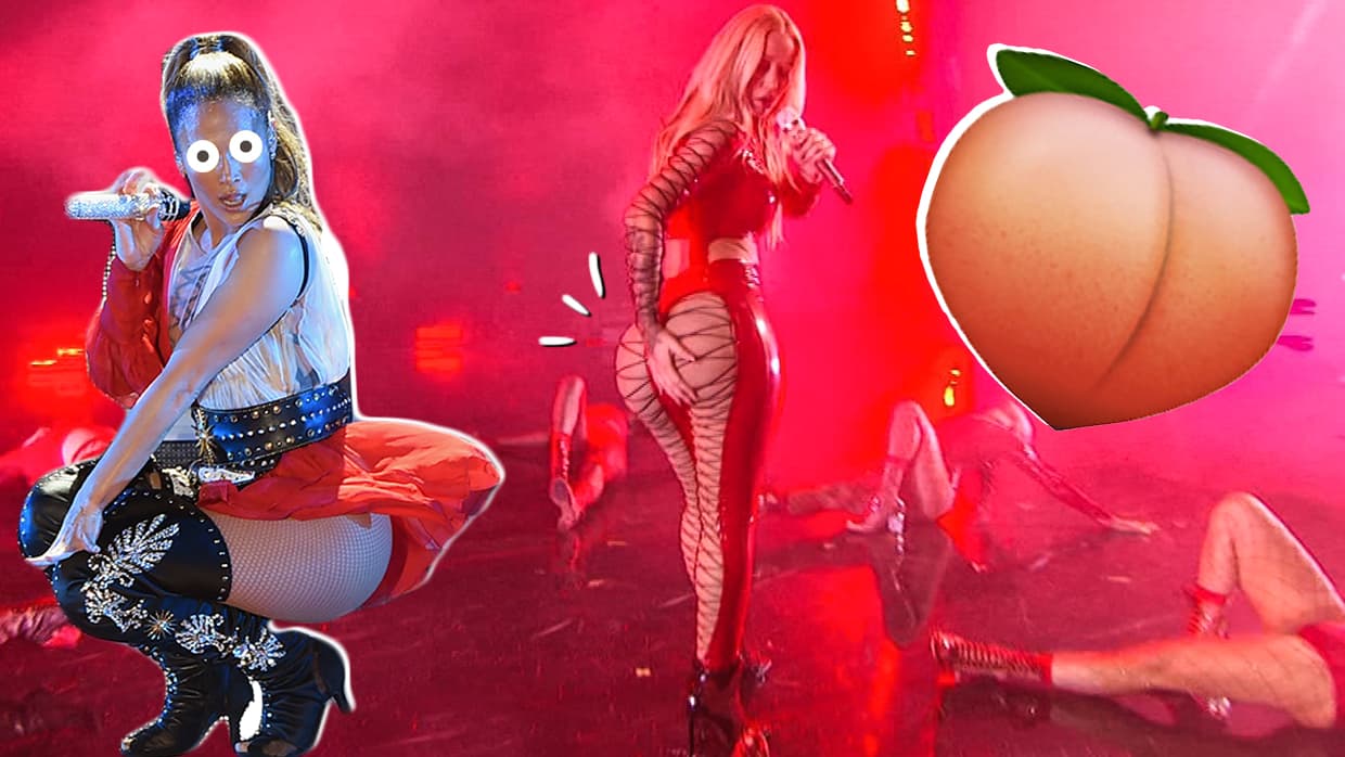 Forrada de látex rojo, la cantante canadiense mostró casi todo su trasero en la interpretación de 'Switch' este jueves. Iggy y JLo grabaron juntas una canción casualmente titulada 'Booty' en 2014.