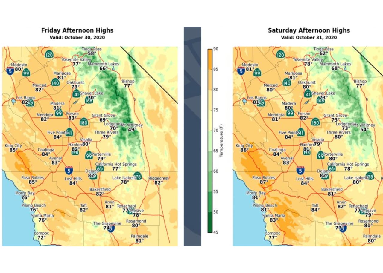 De acuerdo al Servicio Nacional de Metereología en Hanford, las temperaturas de este viernes y sábado estarán en los 80º y 82º como temperaturas máximas promedio en el valle Central, lo que significa que temperaturas 10 grados por sobre lo normal a fines de octubre.