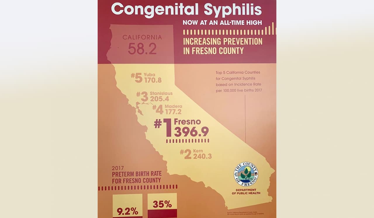 En el condado de Fresno la tasa de nacimientos por cada cien mil habitantes es de 396.9, ubicándose en el primer lugar de la lista de los condados con mayor incidencia de sífilis congénita en California, seguido por el condado de Kern, donde la tasa es de 240.3 bebés contagiados.