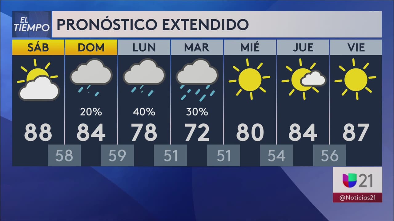 Se prevé un día con cielos parcialmente nublados y temperaturas máximas de 88°F. Para el domingo las condiciones serán similares, pero con un 20% de posibilidad de lluvia.