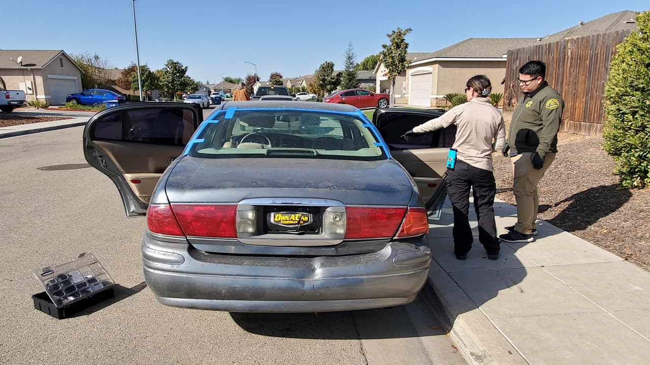 En ese momento, los agentes de la Oficina del Alguacil del condado de Fresno, que ya habían sido alertados de la emergencia, iniciaron la búsqueda de los sospechosos por aire y tierra hasta que dieron con el automóvil Buick color gris, que había sido usado en el atraco. Este fue abandonado en la avenida Florence, entre S. Rachel Ave. y S. Orangewood Drive, y se pudieron recuperar las pertenencias que alcanzaron a sustraer.