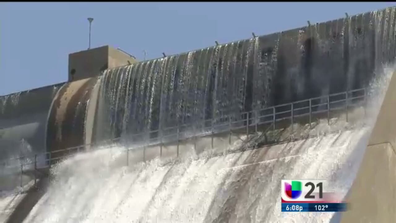 La presa de Friant está tan llena de agua que se desborda por encima.