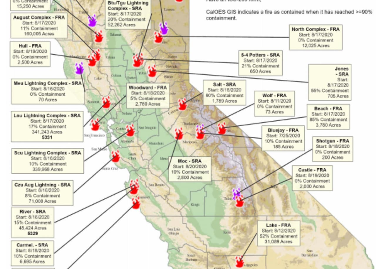 El incendio de SCU Lighting Complex Fire, ubicado en varios condados del norte, incluidos los condados de Stanislaus y San Joaquín; el incendio de Hills Fire, que se progaga al oeste del condado de Fresno; el incendio de CZU August Lightning Complex, cuyas llaman amenazan los condados de San Mateo y Santa Cruz; y el incendio de Lake Fire ubicado en el condado de Los Ángeles al sureste de Lebec están produciendo humo que se está infiltrando en el valle de San Joaquín.