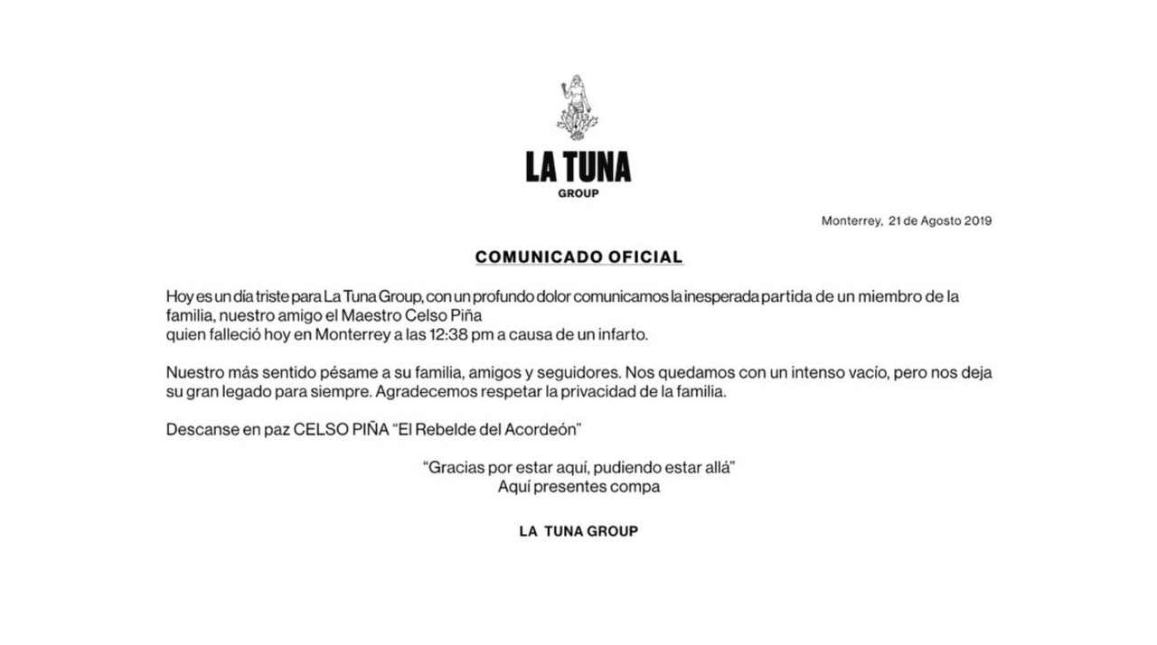 El grupo La Tuna, del cual formaba parte, emitió un comunicado confirmando la muerte de uno de los cantantes de cumbia más exitosos del último tiempo. Piña falleció el mediodía de este miércoles a causa de un infarto al corazón en el Hospital San Vicente de Monterrey.
