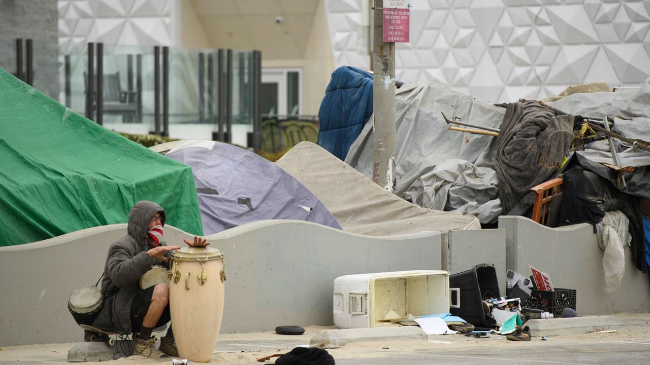El gran número de personas desamparadas que se han ubicado cerca a la playa en Venice ha alarmado a los residentes mientras las autoridades buscan métodos para despejar los campamentos.