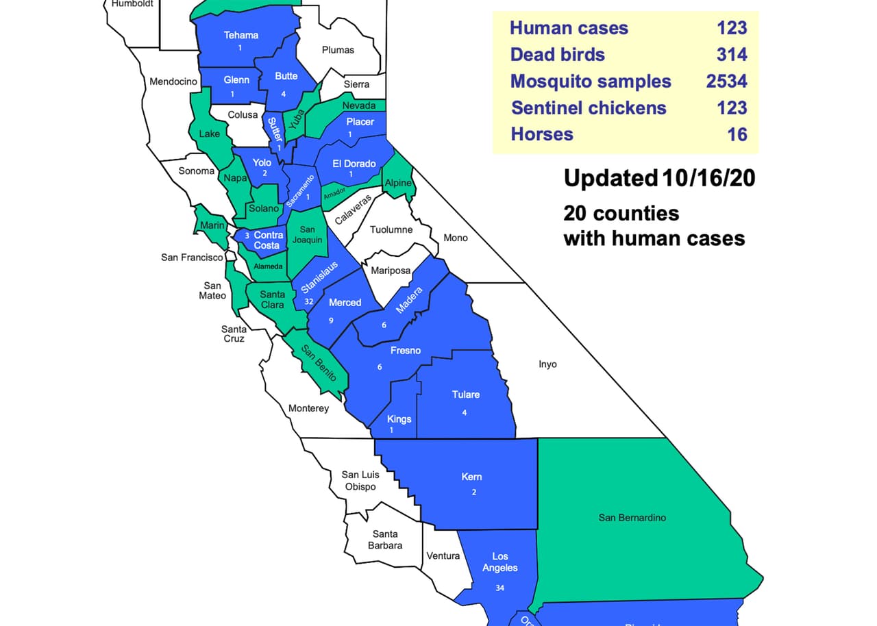Por el momento, el Departamento de Salud Pública del estado reporta casos de virus del Nilo Occidental en humanos en todos los condados del Valle Central. Esto es, 9 casos en el condado de Merced, 6 en Madera, 6 en Fresno, 4 en Tulare, 1 en Kings, recientemente hoy reportados 2 en el condado de Kern.