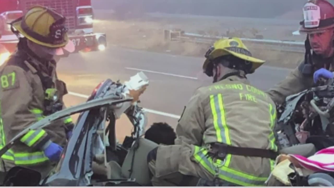 Rescatan a conductor tras impactarse por conducir a alta velocidad entre la espesa niebla en Fresno