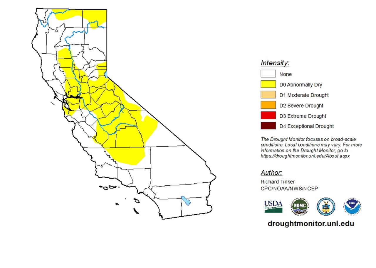 La sequía en el estado dorado alcanza niveles anormalmente secos para esta temporada del año. Aunque está lejos de considerarse sequía extrema como sucedió entre el 2013 y 2016, el problema es que sin lluvias por venir, ésta podría incrementarse.