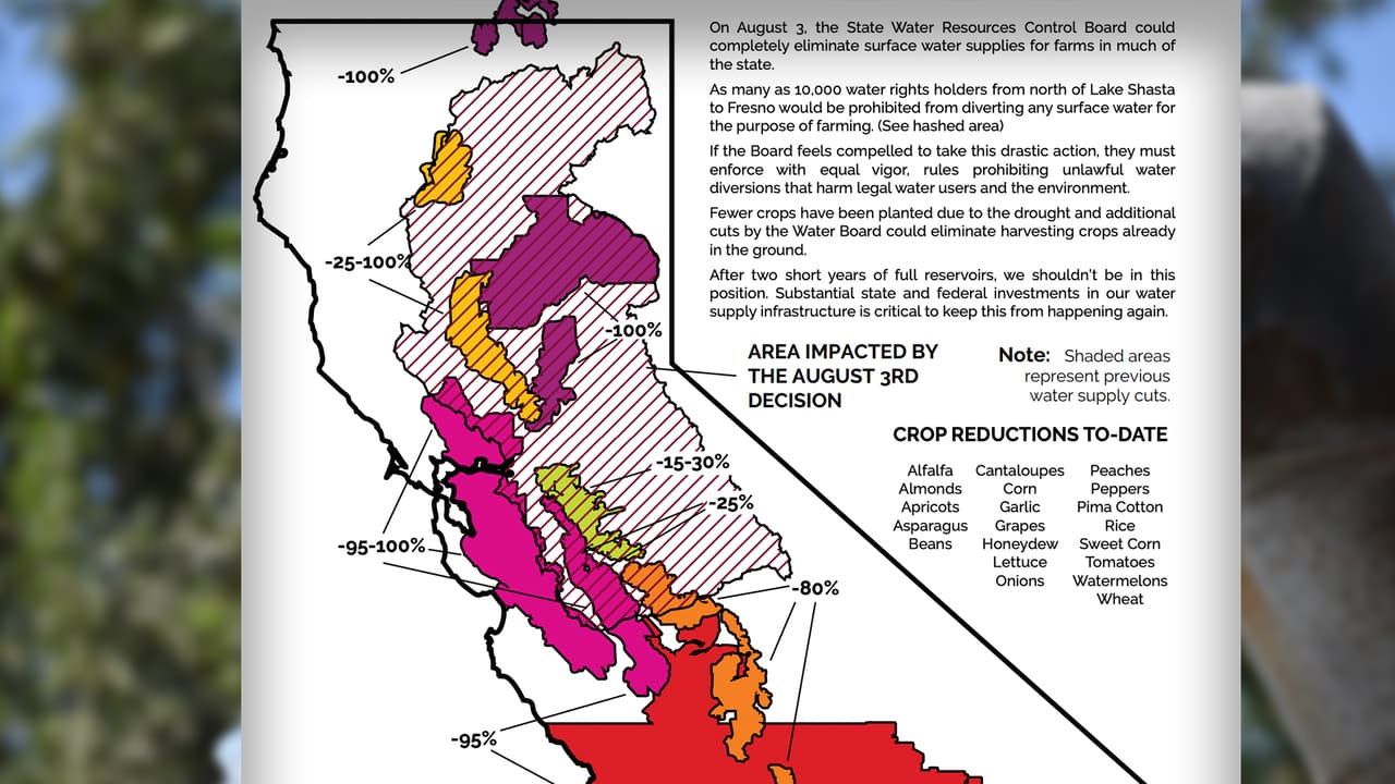 La medida es cuestionada por los propios agricultores, quienes demandan acciones a largo plazo para mantener el suministro de agua, tanto residencial como agrícola. "Pocos cultivos se plantaron debido a la sequía, y estos cortes adicionales de la Junta de Agua podría recortar aún más la cosecha de los ya plantados", advirtió la Junta de Agua para la Agricultura de California.
