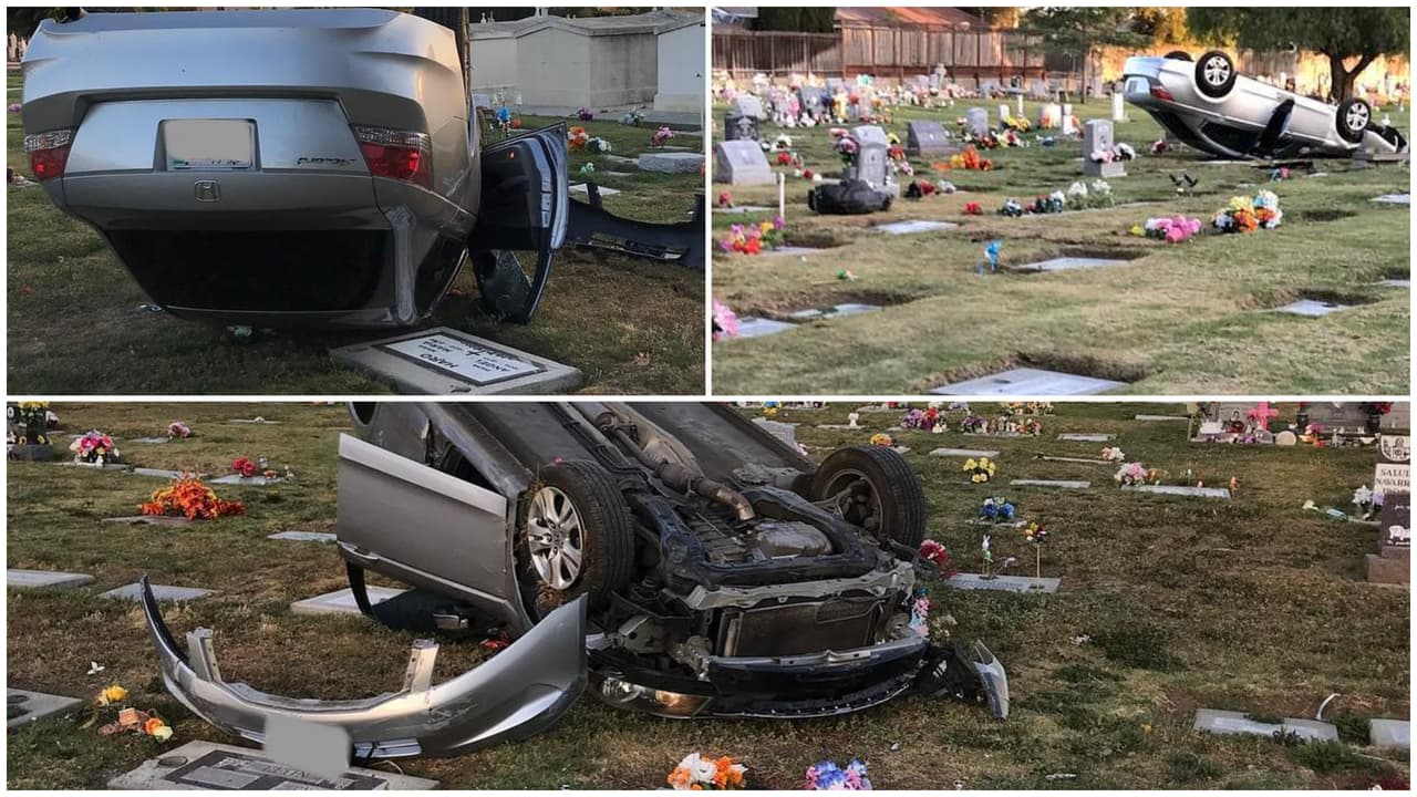 Entre lápidas y con ramos de flores en el frente, así quedó el coche de un automovilista que volcó dentro de un cementerio por manejar bajo los efectos del alcohol. El incidente ocurrió en Hollister.