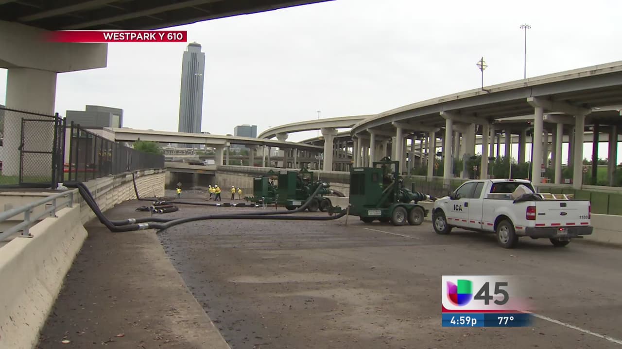 Continúan los trabajos de drenaje del agua que se acumuló en el nivel más bajo del intercambio vial de West Park y 610