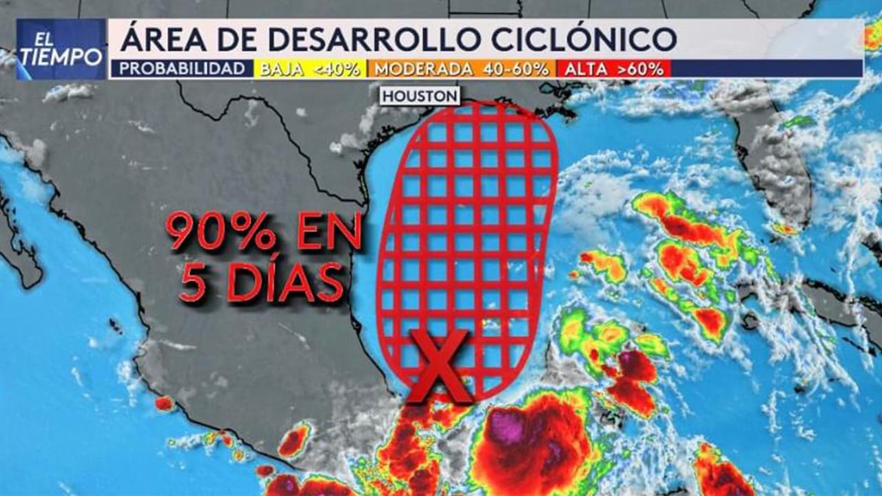 El Centro Nacional de Huracanes señala que existe un 90 por ciento de posibilidad de desarrollo ciclónico en los próximos cinco días del disturbio en la Bahía de Campeche, que podría formarse a última hora del jueves o viernes a medida que avanza hacia por el Golfo de México.