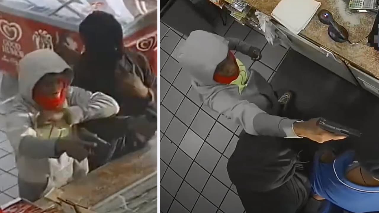 Los dos sospechosos le exigen al trabajador que abra la caja registradora mientras lo apuntan con el arma en la cabeza y lo presionan para que se mueva con rapidez.