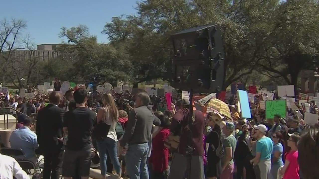 Bajo el lema’ Sin restricciones, sin muro’, miles de manifestantes participaron en una marcha proinmigrantes en Austin