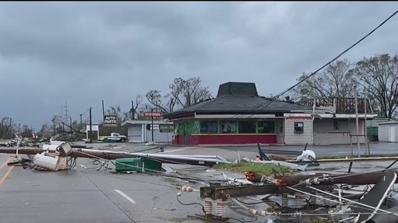 En las calles se puede ver el rastro del fenómeno que tocó tierra como huracán de categoría 4 la madrugada de este jueves en el área de Cameron. Así se ve el centro de la ciudad.