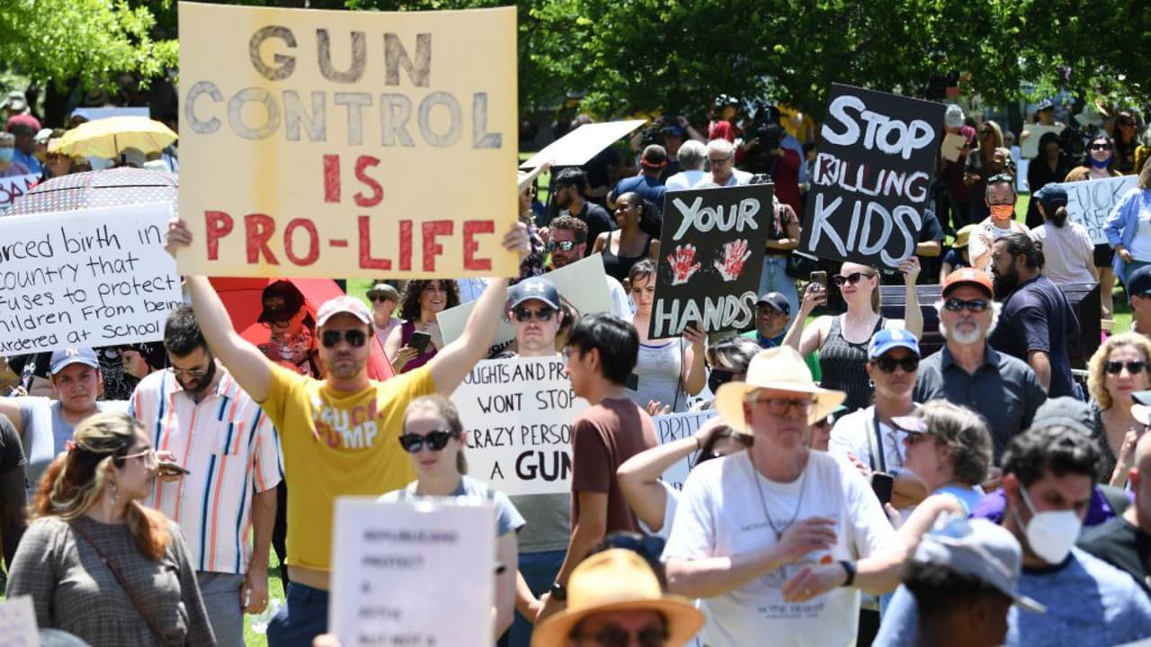 Decenas de personas se han congregado con pancartas a las afueras del edificio en Houston donde se está realizando la convención de la Asociación Nacional del Rifle (NRA) para protestar en contra del evento y exigir cambios legislativos en la regulación de armas de fuego en EEUU. Se espera que este viernes el candidato demócrata a la Gobernación de Texas, Beto O'Rourke, realice un evento en el Parque Discovery Green para pedir leyes más estrictas y evitar masacres como la de Uvalde.