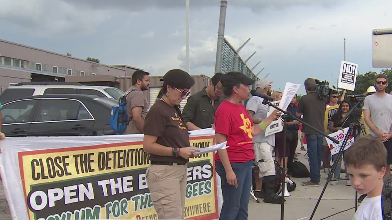 La protesta se registró este jueves a las afueras de las que pretenden ser instalaciones de detención migratoria. Los manifestantes lanzaron consignas en contra de esta medida migratoria del Gobierno Federal. Los protestantes aseguran que las autoridades federales tienen un doble discurso ya que a pesar de la orden ejecutiva de Trump continúan con la intención de seguir separando a menores de sus padres en la frontera.