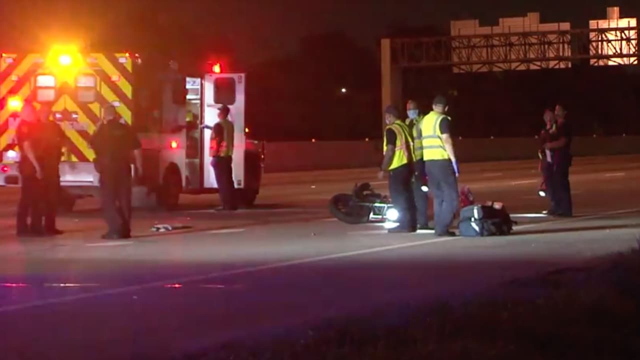 Llamadas reportaban que una mujer caminaba por los carriles de la autopista 610 en Houston y un motociclista la atropelló y su moto se estrelló.