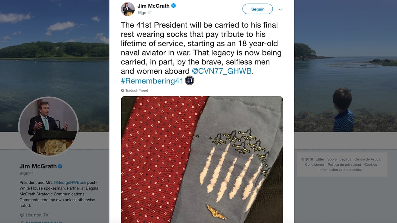 "El presidente 41 irá a su morada final calzando medias que rinden tributo a su vida de servicio, empezando como aviador naval a los 18 años. Ese legado está siendo llevado, en parte, por los valerosos, desprendidos hombres y mujeres a bordo", escribió en su cuenta Twitter el portavoz de Bush padre, Jim McGrath.