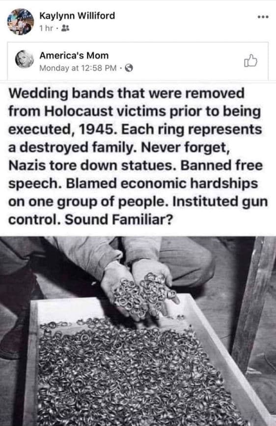 El post decía: “A las víctimas del Holocausto les pedían que se quitaran sus anillos de matrimonio antes de ser ejecutadas. Cada anillo representa una familia destruida. Nunca olvidemos. Los nazis derribaron estatuas. Prohibieron la libertad de expresión. Culparon de la crisis económica a un grupo de personas. ¿Les suena familiar?”.