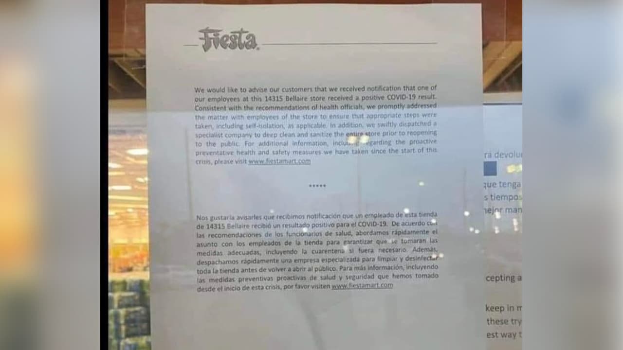 El supermercado Fiesta ubicado en la cuadra 14315 Bellaire Blvd, al suroeste de Houston, informó que uno de sus empleados dio positivo al coronavirus y que contrataron a una compañía para limpiar y desinfectar el establecimiento.