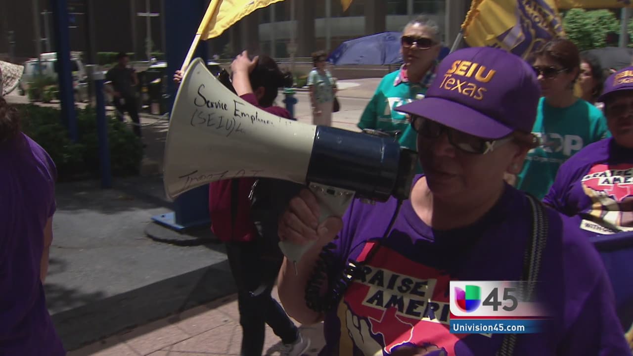 Empleados de limpieza en Houston realizaron una manifestación para exigir mejores condiciones de trabajo en la compañía PJS.