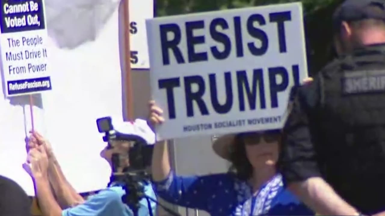 En medio de fuertes medidas de seguridad, Trump es recibido en Crosby, Texas, por simpatizantes y detractores