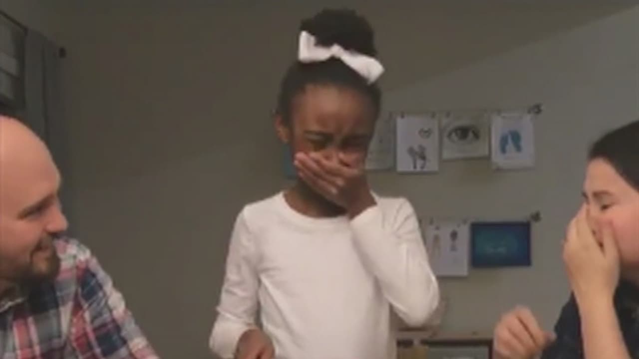 La menor rompe en llanto de felicidad al enterarse de que será adoptada legalmente por la familia que la acogió durante los últimos tres años. Los dos hermanos menores de la niña también serán acogidos por la pareja.