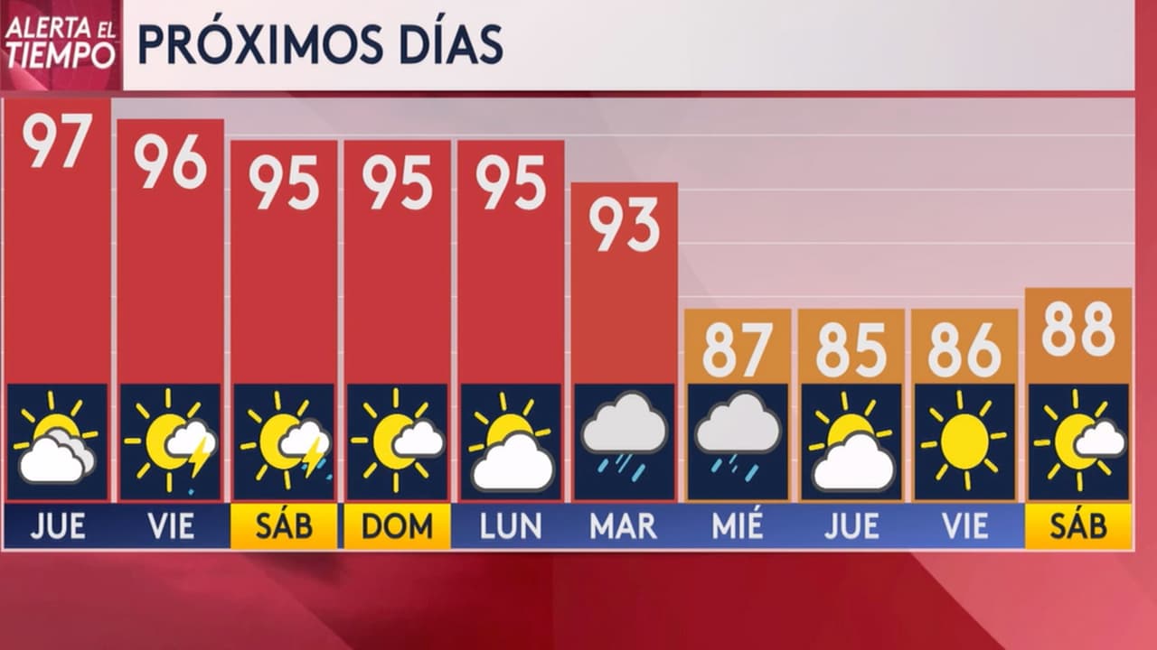 Se esperan temperaturas cálidas ubicadas en los 95 grados Fahrenheit en promedio, con probabilidades de lluvia el sábado, indica Gastón Heredia, jefe de meteorología de Univision 45.